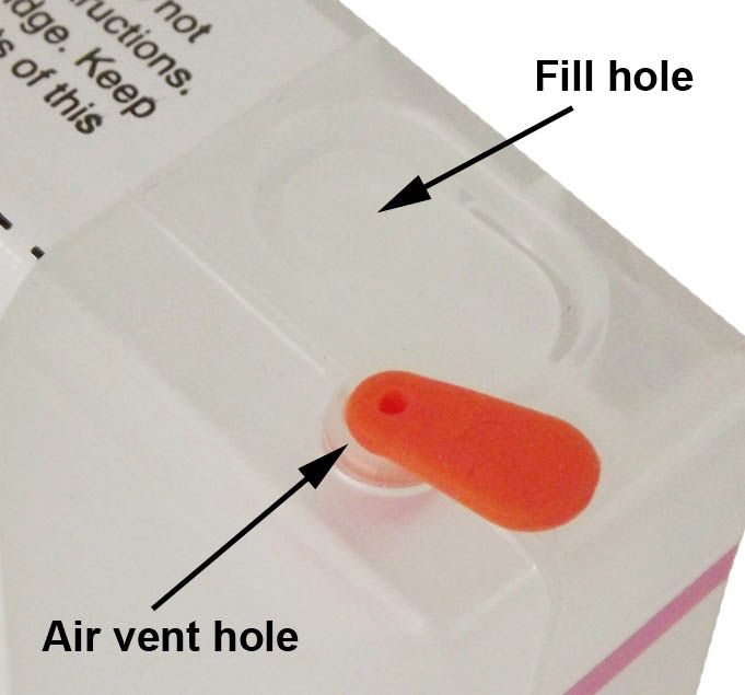 Please refer to the photos above to familiarize yourself with the cartridge parts before filling. If you are filling cartridges for the first time, unwrap and inspect them for damage. Contact Inkjetmall if you suspect that a cartridge is damaged. Make sure the chip is attached straight and flush on top of each cartridge. Also, make sure a plug is in both the fill and air vent holes on top of each cartridge. If not, please check inside the cartridge wrapping before you discard it. Be careful not to touch the chip contacts and be aware chips are sensitive to static or electrical shock, which can short them out. We recommend everyone have a set of spare chips on hand in case any need to be replaced. Chips are very easy to replace by following instructions on page 4.