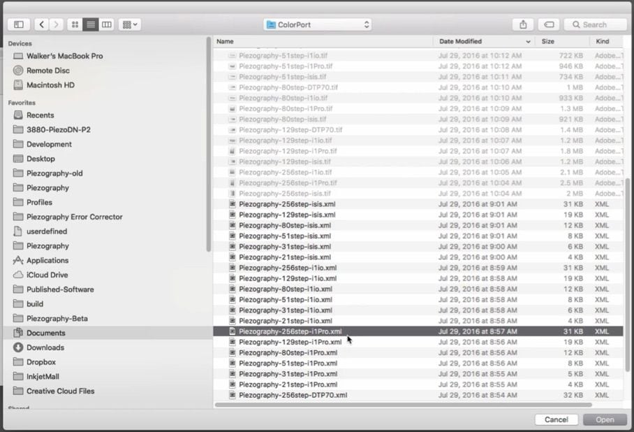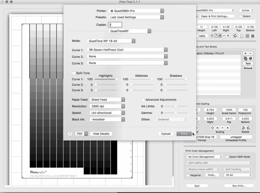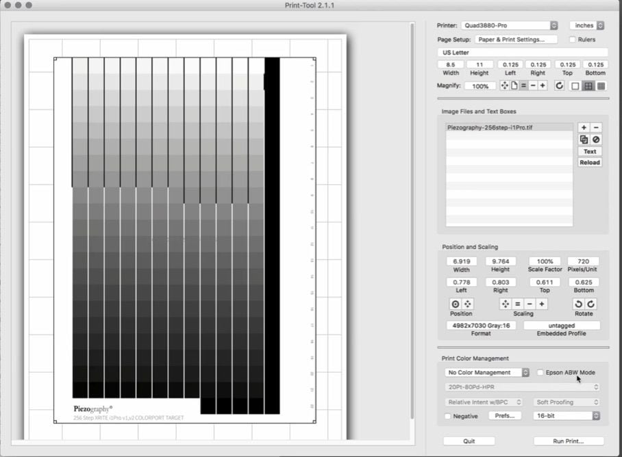 Open Print-Tool (or QTRgui if using PC), then open the correct 256step target “.tif” file. All of the target files are named with how many gray steps they have (256 in this case), and what device/software combination they are built for. For example, there’s a target built with 256 patches for the i1Pro2 device, using the ColorPort workflow, and it’s named: “Piezography-256step-i1Pro.tif” (shown in the Print Tool window), located in the ColorPort folder. Find your correct target. If you are confused by this please read the requirements.