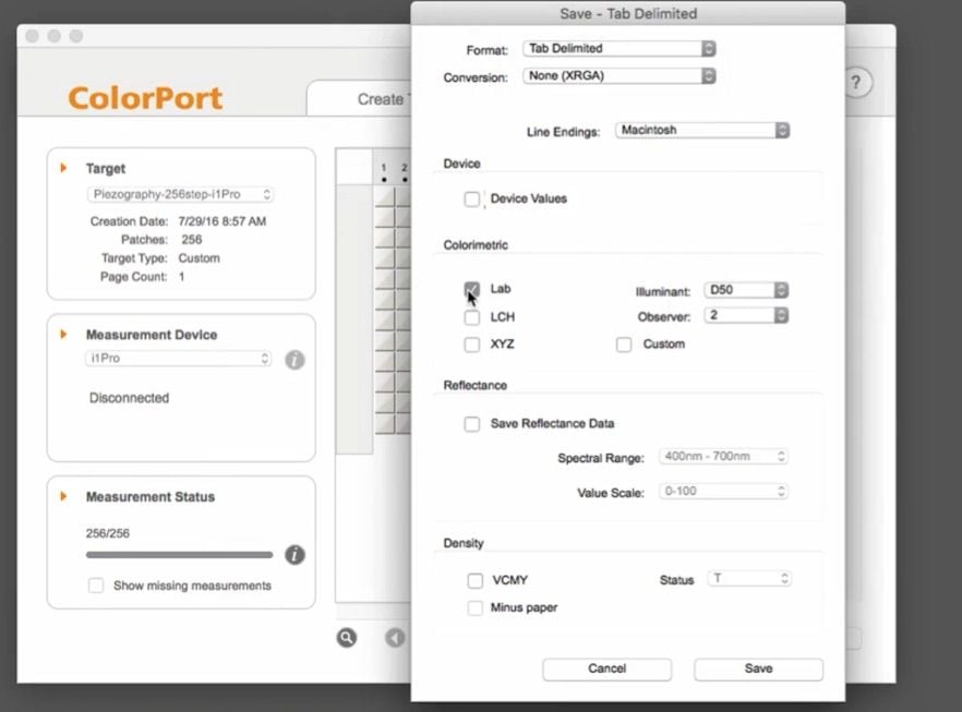 After the target has been measured, click “Save Data”. Select “Tab Delimited” as the data format, and check the “Lab” check box on. Save the file to your desktop. This is a temporary txt file with just the L*a*b* numbers from the measurement.