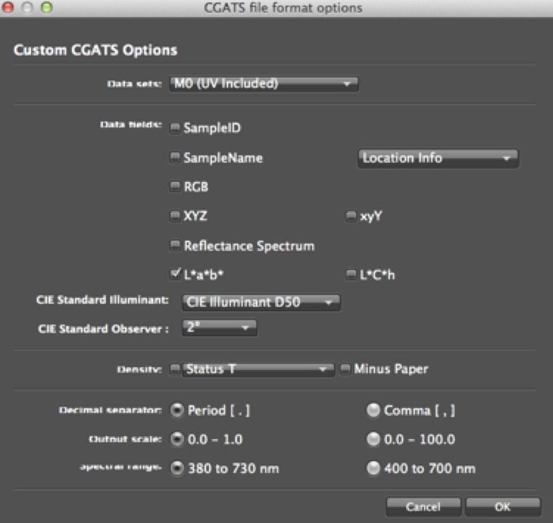 After the target has been measured, click “Save”. Select “M0 (UV Included)” as the data sets, then check the “L*a*b*” check box, and uncheck all other boxes. Save the file to your desktop. This is a temporary txt file with just the L*a*b* numbers from the measurement.