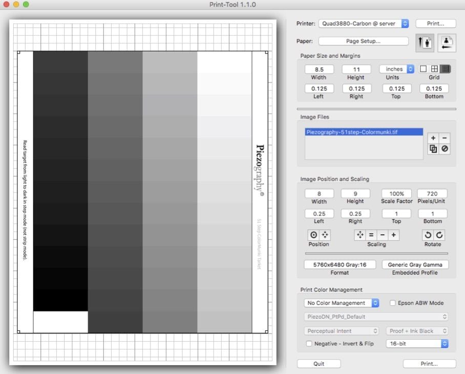 Open Print-Tool (or QTRgui if using PC), then open the correct 51step target “.tif” file. All of the target files are named with how many gray steps they have (51 or 129 step in this case), and what device/software combination they are built for. For example, there’s a target built with 51 (and 129) patches for the ColorMunki device, using the ColorPicker software, and it’s named: “Piezography-51step-Colormunki.tif” (shown in the Print Tool window, below), located in the ColorMunki folder. Find your correct target. If you are confused by this please read the requirements listed above.