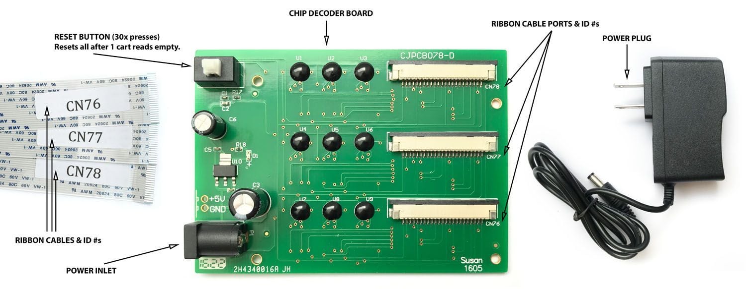 14. Plug the other ends of the ribbon cables (CN78, CN77, and CN76) into the corresponding cable ports on the chip decoder (as labeled on the chip decoder board). The metal contacts on the ribbon cables should be facing down.