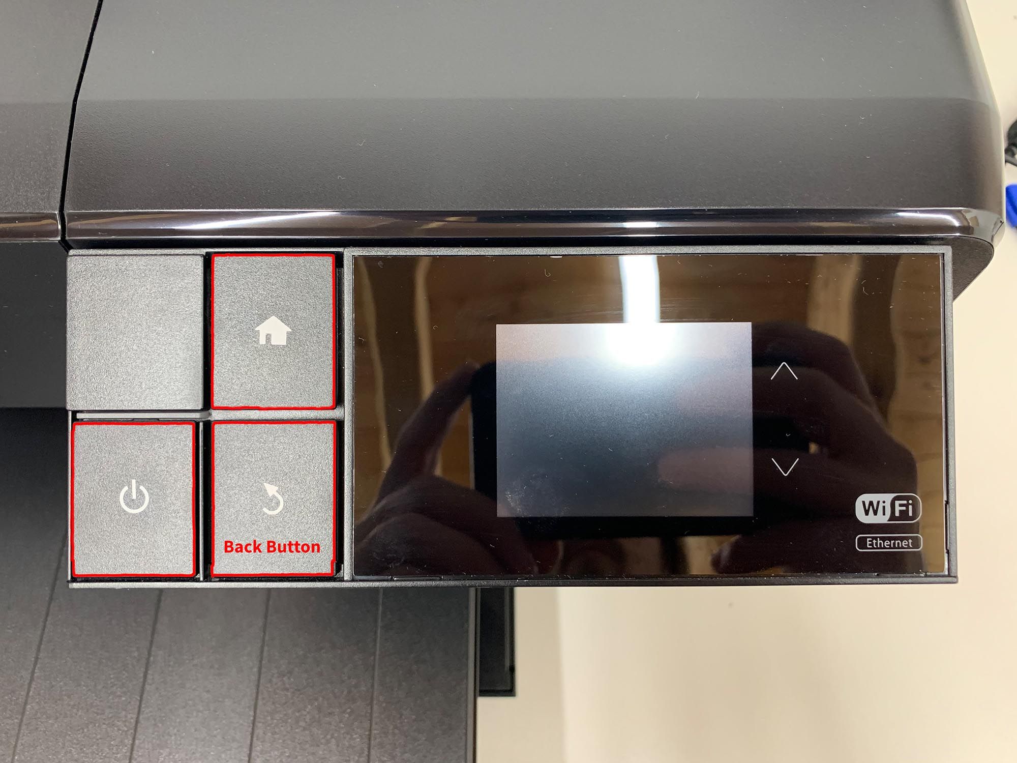 Press and Hold the following buttons for no less than 3 second and no more than 5 seconds: BACK + HOME + POWER and then release only the BACK button. Keep holding the Home and Power buttons. Eventually you will see white text and this means you are in Firmware Update Mode. If you see Red text it didn't work and you need to release all buttons, power off the printer, and try again. You can release the HOME and POWER buttons when that WHITE text appears.
