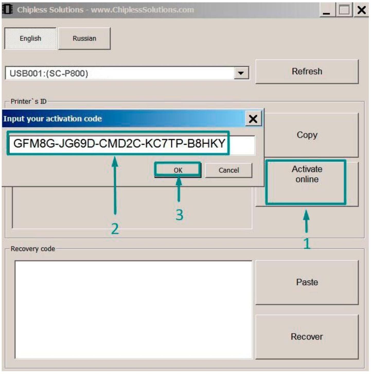 Copy/Paste your license key. The software will then activate the chip-less firmware on your printer.