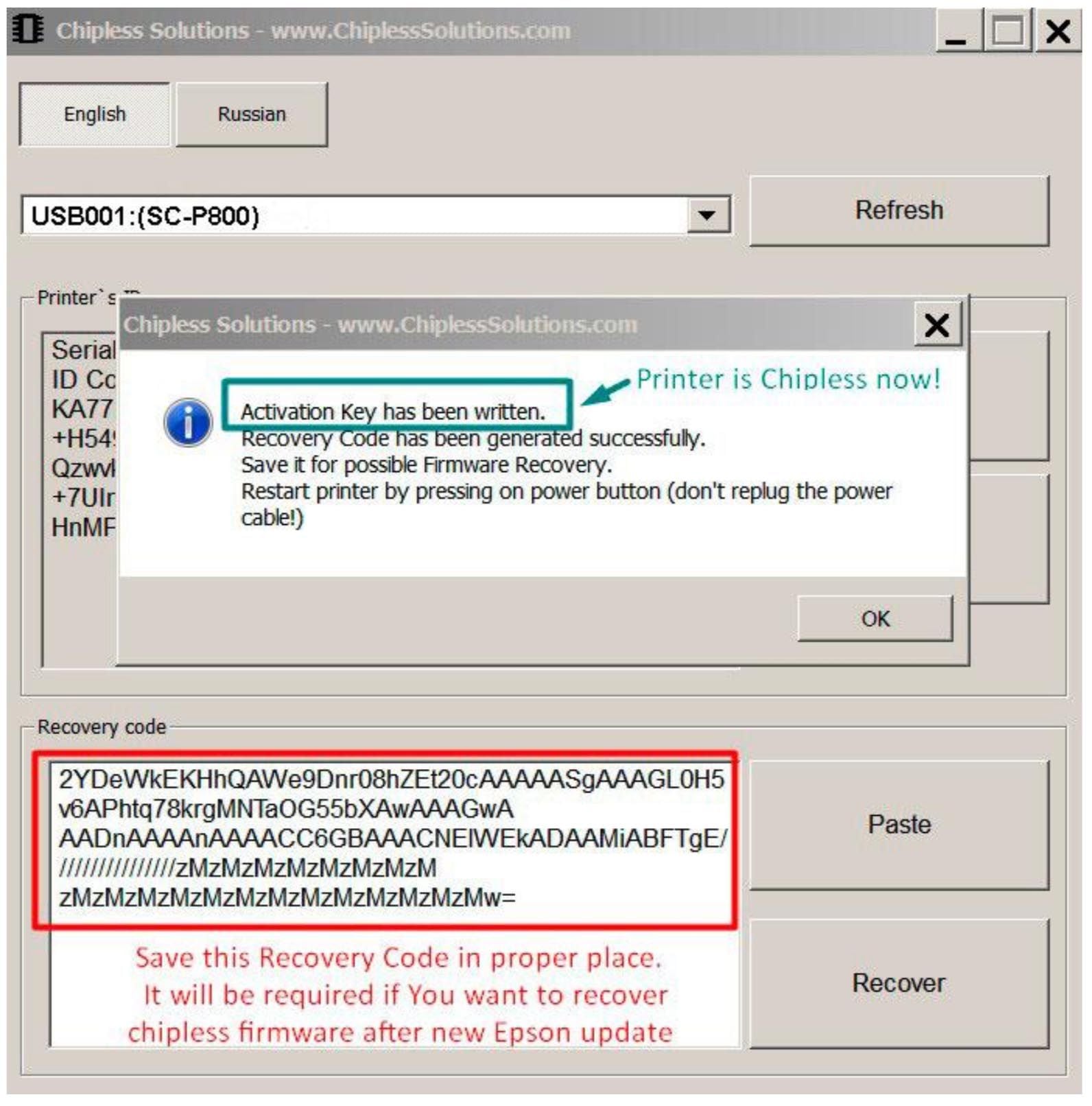 IMPORTANT: Copy/Paste and Save the "recovery code" that appears after the firmware is activated. You will need this if you ever need to re-install the chip-less firmware on this printer.