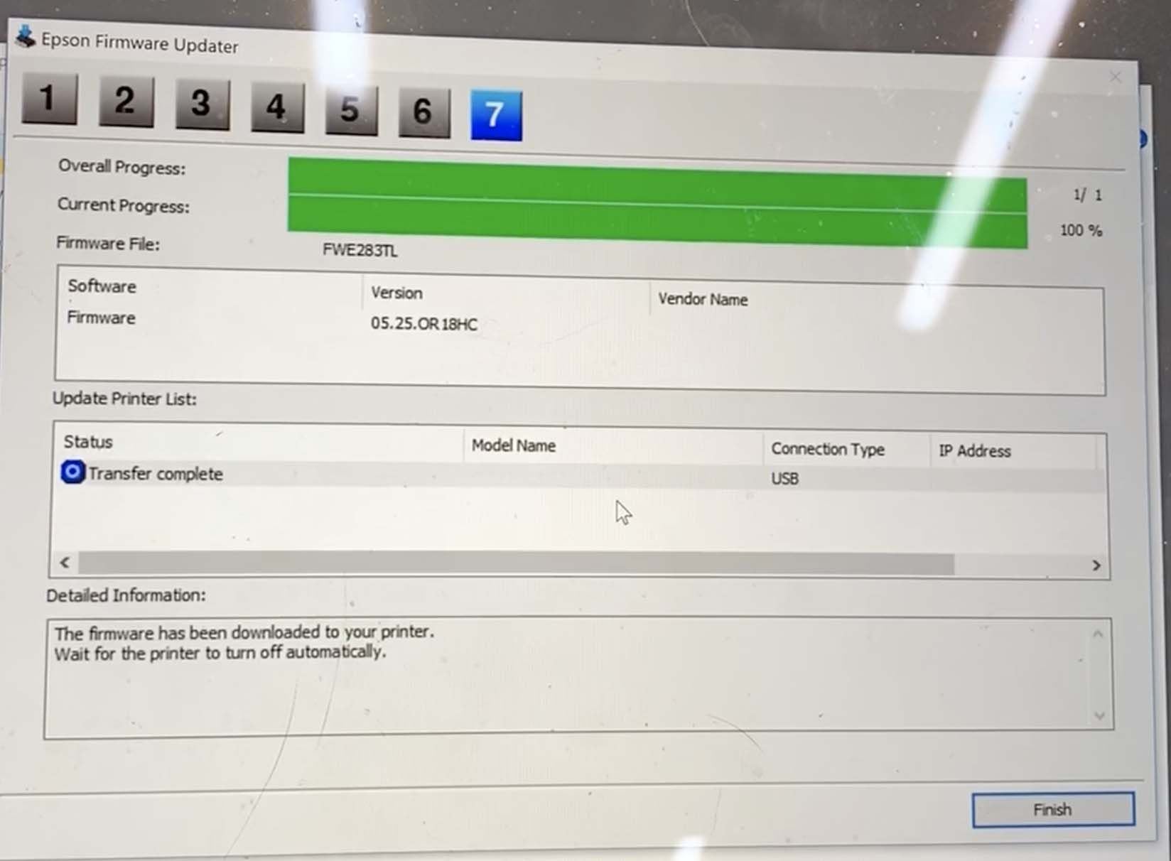 This will take several minutes and the blue power light on the printer will be blinking the entire time. After several minutes (and well after it says "complete" on your computer) the printer will show the firmware version that you just installed. Verify that it's the same as the firmware as-shown on the EPWUPD program and then power off your printer.