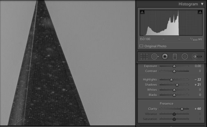 The sliders used to adjust this steeple are not severe and yet when you look at the resulting output in Photoshop in the next illustration - you can plainly see the masking line that was produced. Certainly too much Clarity is involved. But this making line will print like a sore thumb and prevent any more image sharpening from being used. This line would only grow with pixel sharpening.