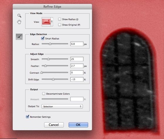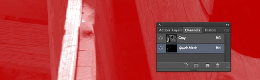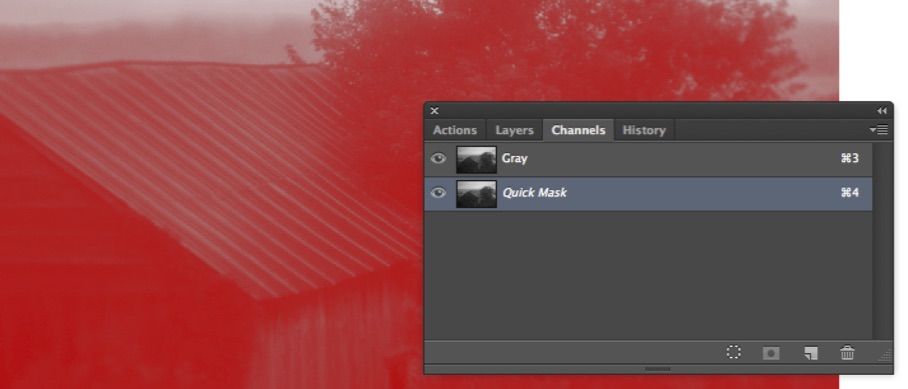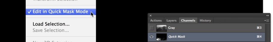 2) Edit in Quick Mask Mode. You can also type the shortcut command of Q to go in and out of Quick Mask Mode. This creates a temporary channel the same as the selection.