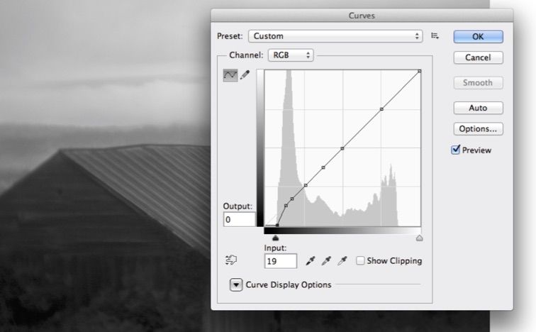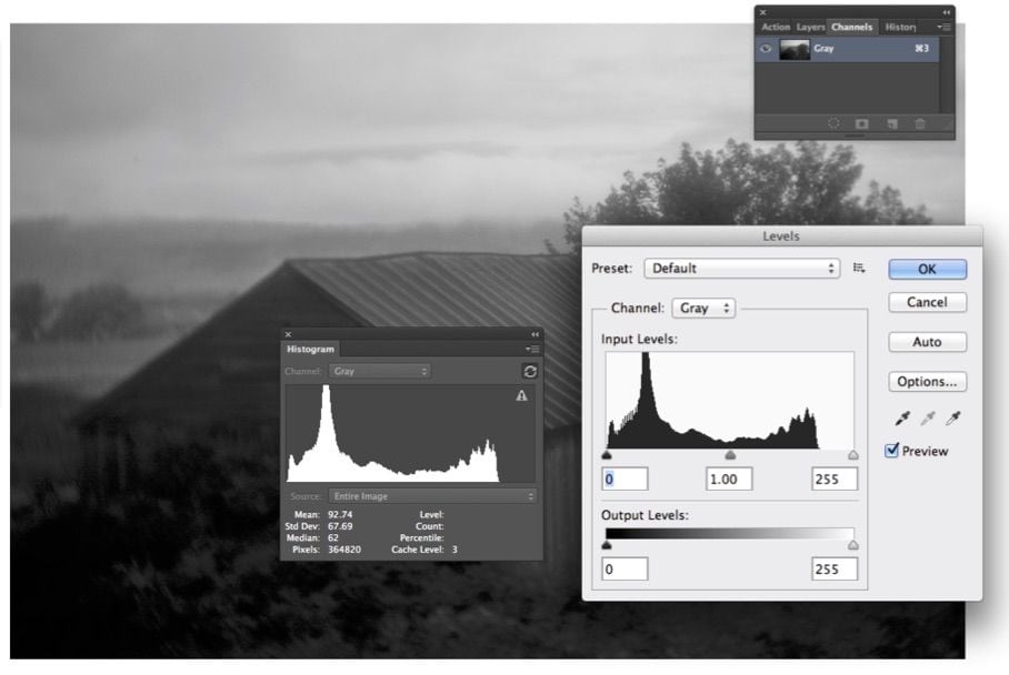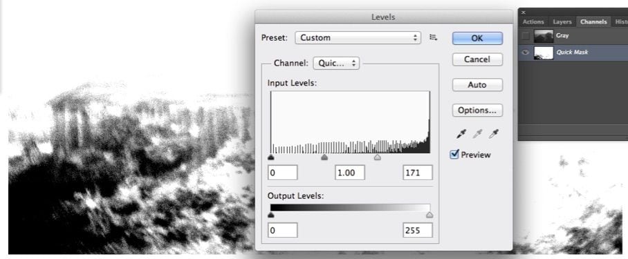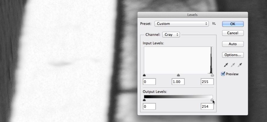 Just a little Output Levels should complete it. Notice that the Levels’ histogram