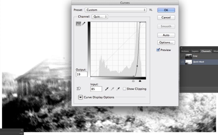 5) A Curve is used on the Quick Mask Channel to eliminate most of the information other than the darkest shadows (where we want to touch with some black while leaving the rest of the image untouched.)