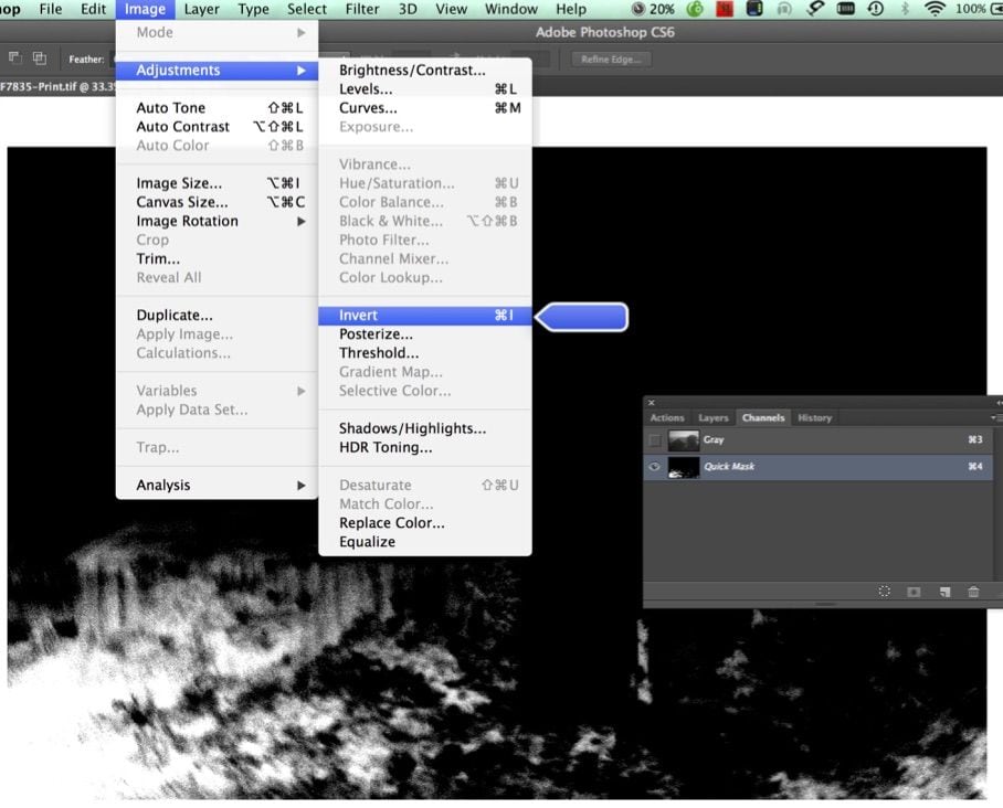 7) The Quick Mask Channel is Inverted because Selections are white and masked areas are black. Now the channel is a proper selection that incorporates only the darkest areas of the image.