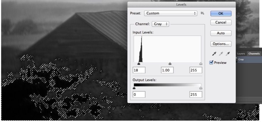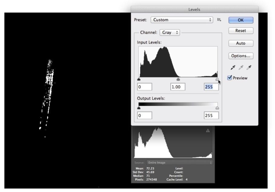 6) Levels is used to reduce the mask further. Some of the lighter area is left behind to soften the mask. You could Erase or Dodge anything else you want removed from the Mask. The next step will be to invert the Channel.