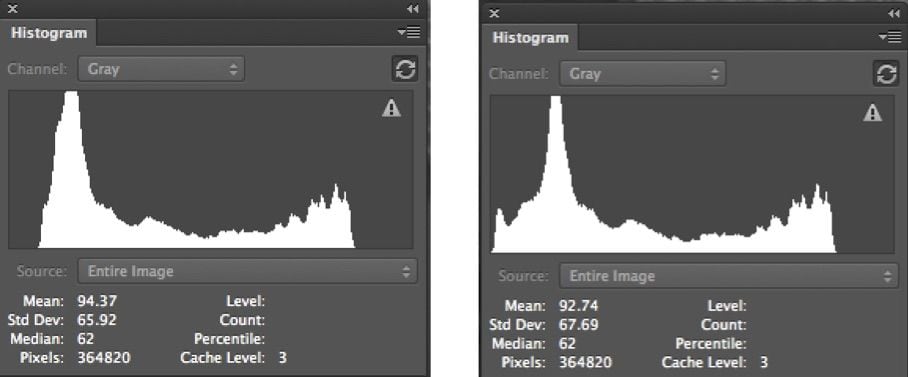 11) The Selection is turned off by deselecting it. The Histogram on the left is the actual Histogram of the image now. The Levels dialogue is open only to show that its histogram is the same as the image Histogram.