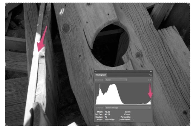You can use this trick for the black point also. It will show you all of your black pixels and you may be surprised how few you might have. But, in this case we are just confirming that we have specular highlight on the wood. The following exercise is how to repair specular when it is unwanted. It is very similar to the exercise in touching shadows. But, we will need to add noise and blur to the selection we create with Quick Mask.