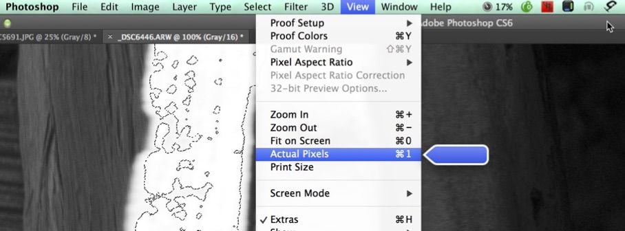 Once you are out of Quick Mask, you will need to edit in Actual Pixels view so you can carefully see your work. The goal will be to “manufacture” pixels!