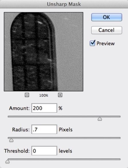 The basics of it are that you must define the pixel radius. Generally speaking you will most definitely see the sharpening lines with a radius over .8. I use .7 so that anything I slightly oversharpen will not reveal contrast lines. The Amount is the intensity with which you wish to sharpen. I can sharpen as high as 250% with a Radius of only .7. Threshold is a smoothing routine in which anything more than 0 will allow some smoother parts of your image to escape any sharpening. The higher the Threshold the more that remains smooth. The Threshold is related to the difference in gray values.