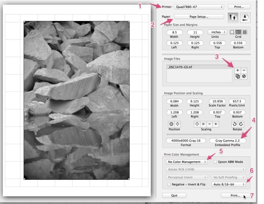 Before clicking the Print button you need to make certain that your printer is in great operating condition. Great is better than good. Piezography is very sensitive. Everything about it tends to reveal more deficiencies. It really requires a printer in peak operating condition.