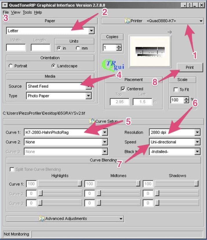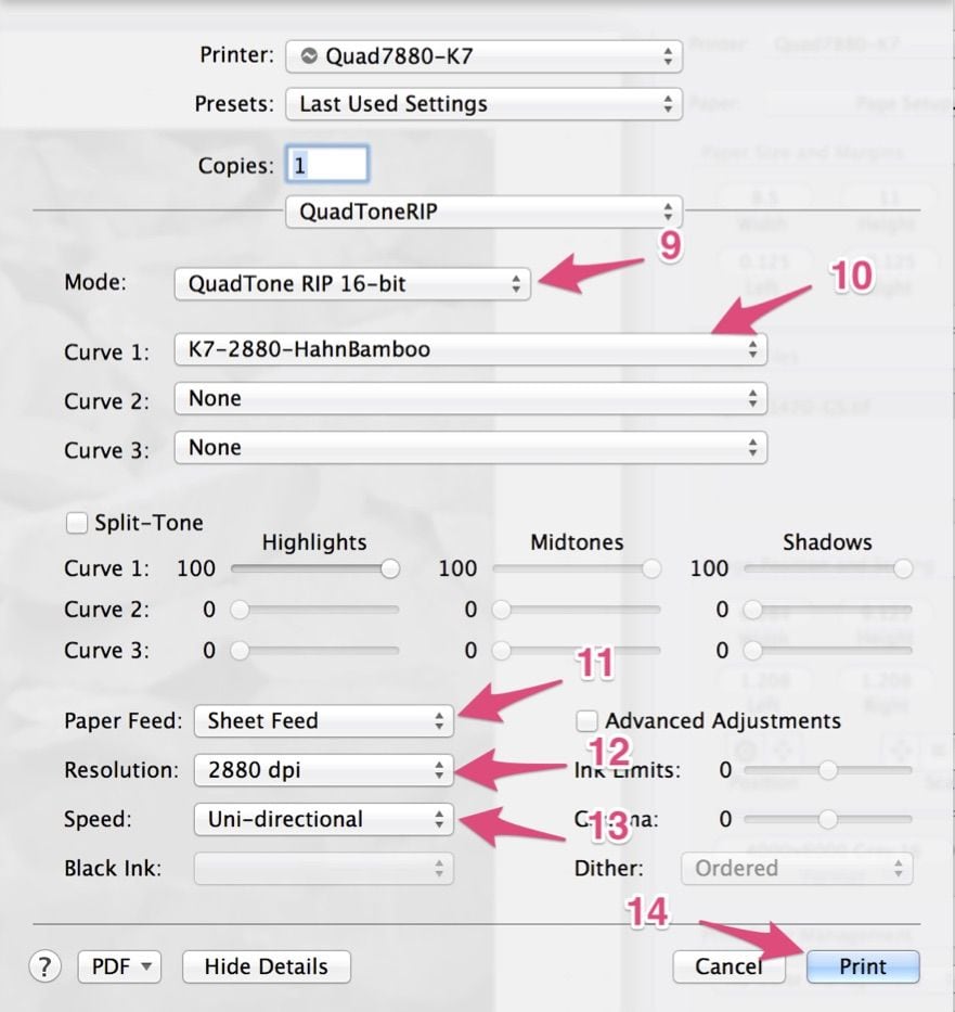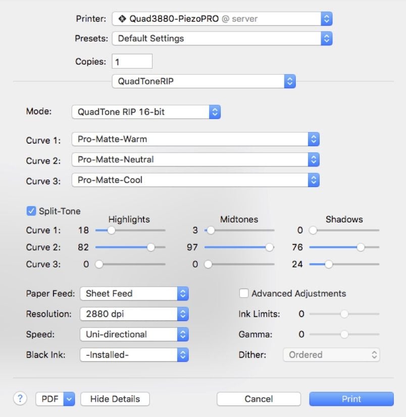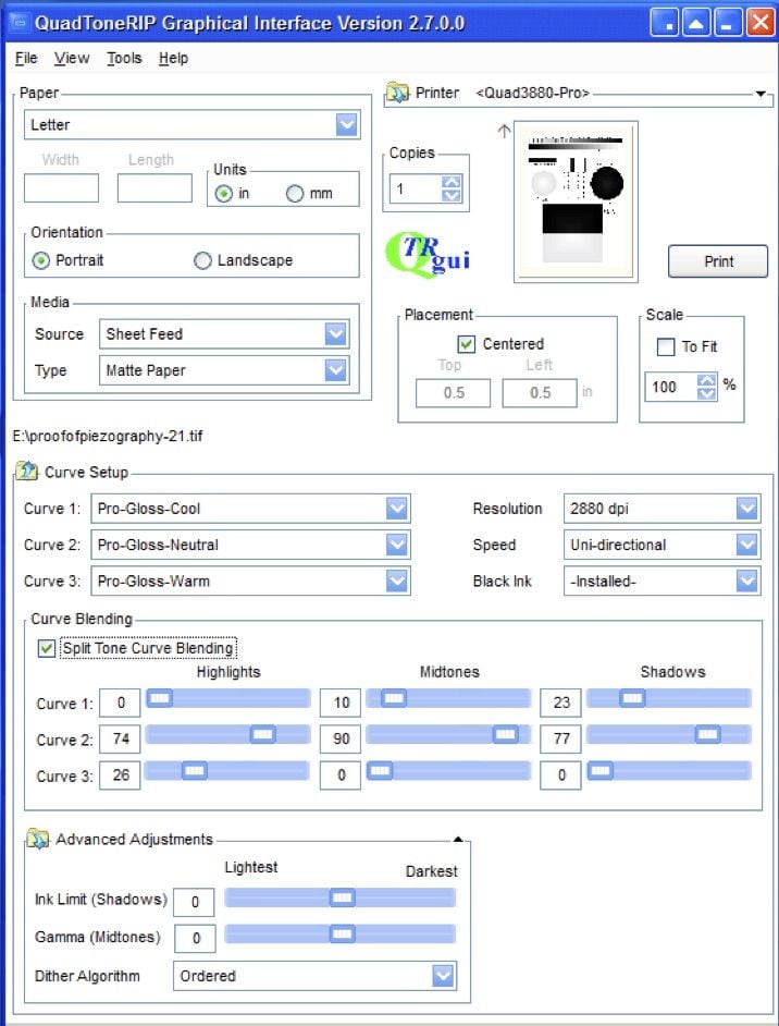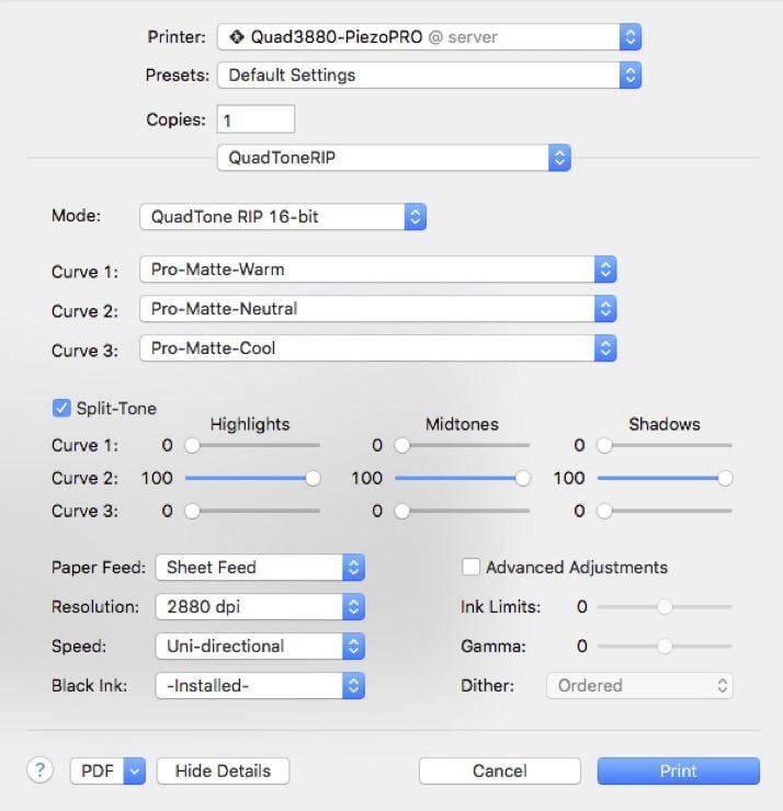 The beginning steps of printing with Piezography Pro are the same as with other all Piezography systems, but the difference is the curve selection in QuadTone RIP. Instead of selecting just one media curve as you do with Piezography K7/K6/P2, you select THREE curves with Piezography Pro, and use QTR sliders to blend the curves. For each paper, we provide three curves: Neutral, Warm and Cool.