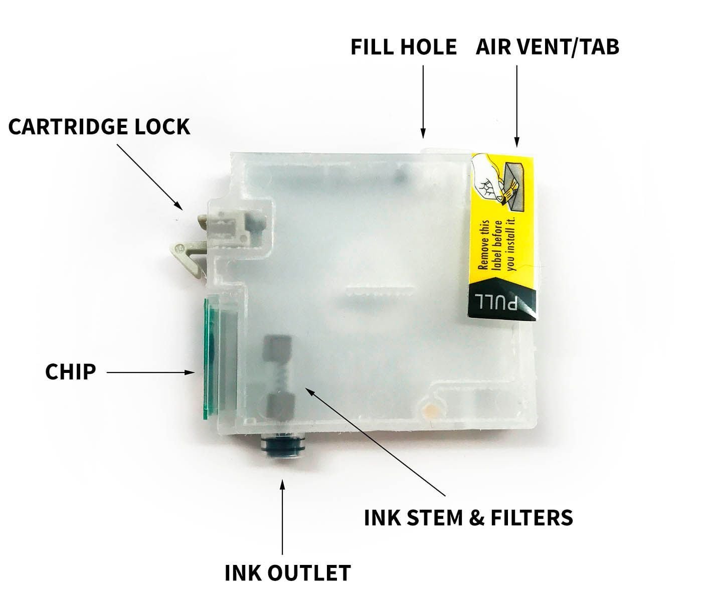 Remove colored plug from cartridge fill hole and leave air vent hole OPEN. Draw 15ml ink into the syringe. Leaving needle attached to syringe, insert needle tip into cartridge fill hole. Hold cartridge with fill hole up and ink outlet down then gently push syringe plunger to slowly refill cartridge with ink. Tap side of cartridge with your knuckle to release trapped air and allow ink to settle then continue filling. During this process you can place a finger over the vent hole or tape over it temporarily. This keep ink from entering the vent tab filter area. Make sure never to let your carts tip over during the refill process!