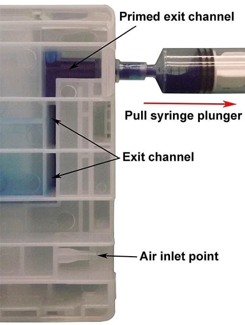10. Once you see ink flowing take your priming syringe out and eject the excess ink back into your ink bottle.
